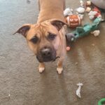 Bella is an American Bulldog Golden Retriever mix and is an absolute sweetheart who is absolutely crazy about running around the yard and just having a blast. She is full of energy and happiness and loves to play with people and other dogs that she’s comfortable around. She is however, very shy and anxious, and can get easily scared by loud noises such as bangs, yelling, etc. Patience is required with her when it comes to getting her accustomed to unknown environments and new people. She is crated trained and leash trained, and absolutely loves to play and wrestle with her sister. She is also emotionally attached with her sister, Zelda and would benefit her greatly if they went together if possible! She loves cuddles and playing with chew toys, tennis balls, and bones. She also has such a cute little happy dance when she taps her feet when she gets excited with the biggest smile you’ve ever seen! If you’re somebody who loves to spend time outside and has some patience to help her ease into her environment and meeting strangers, she’s one of the most infectious energetic and happy dogs you’ll ever see!