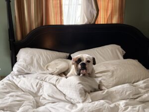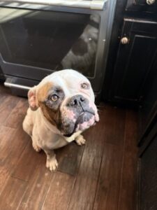 Sophie is pure love. She is very quiet and does not complain. She is a devoted companion and a quick learner. Sophie loves to play ball and if she does not want to give you the ball back after she fetches it, she is happy to play by herself. She is very curious and wants to know what you are doing, especially if you open a cabinet. She is motivated by treats and love. She is pleasant during a bath and behaves nicely in a car. She is happy to relax but it does her soul good to expend some energy playing or going for a long walk. She is both gentle and very strong.